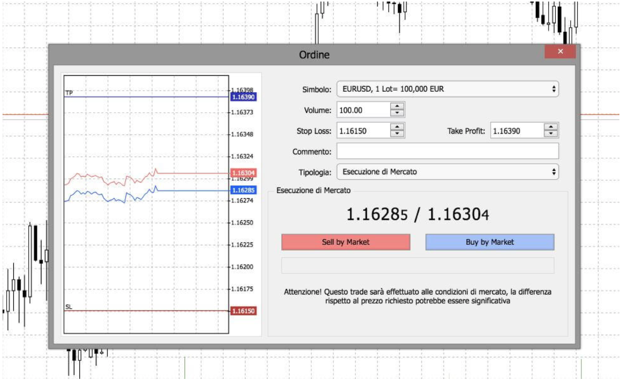 We then display a window, called “Order”, which indicates the desired symbol (EURUSD), the desired lot volume (1 lot = 100,000), the stop loss and take profit value that we want to set (optional but suggested) and a red “Sell by Market” button to sell, or a blue “Buy by Market” button to buy.
